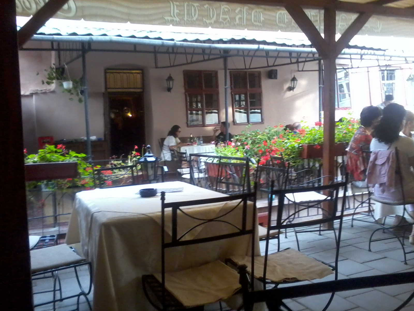 But out back it’s just a pleasant terasa, an outdoor cafe. I believe I had a coffee to drink. I know The Woman had some brownies with bechamel or something, which she dutifully reported to be quite delicious.