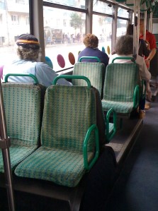 This is a shot from the interior of a Cluj city bus. For those of you who are interested in such things, this is a Renault vehicle, originally built to service Paris. Although unreadable in this photo, all the interior signs and markings in this bus are still in French, which I consider to be a free daily lesson in a language I don’t really speak :) Also, although again not very discernible in this photo, the man on the left is wearing a Telefonica (Spanish telephone company) cap.