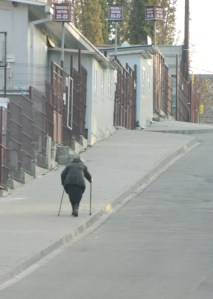 A week ago, I was waiting to meet with the ProTV crew for the first time. Since it’s difficult to find my home address (if you’re not a long-time resident of Cluj) I told them to meet me near the CFR stadium. As I waited, I saw this elderly lady pass me and doggedly climb the hill with the use of her walking sticks.