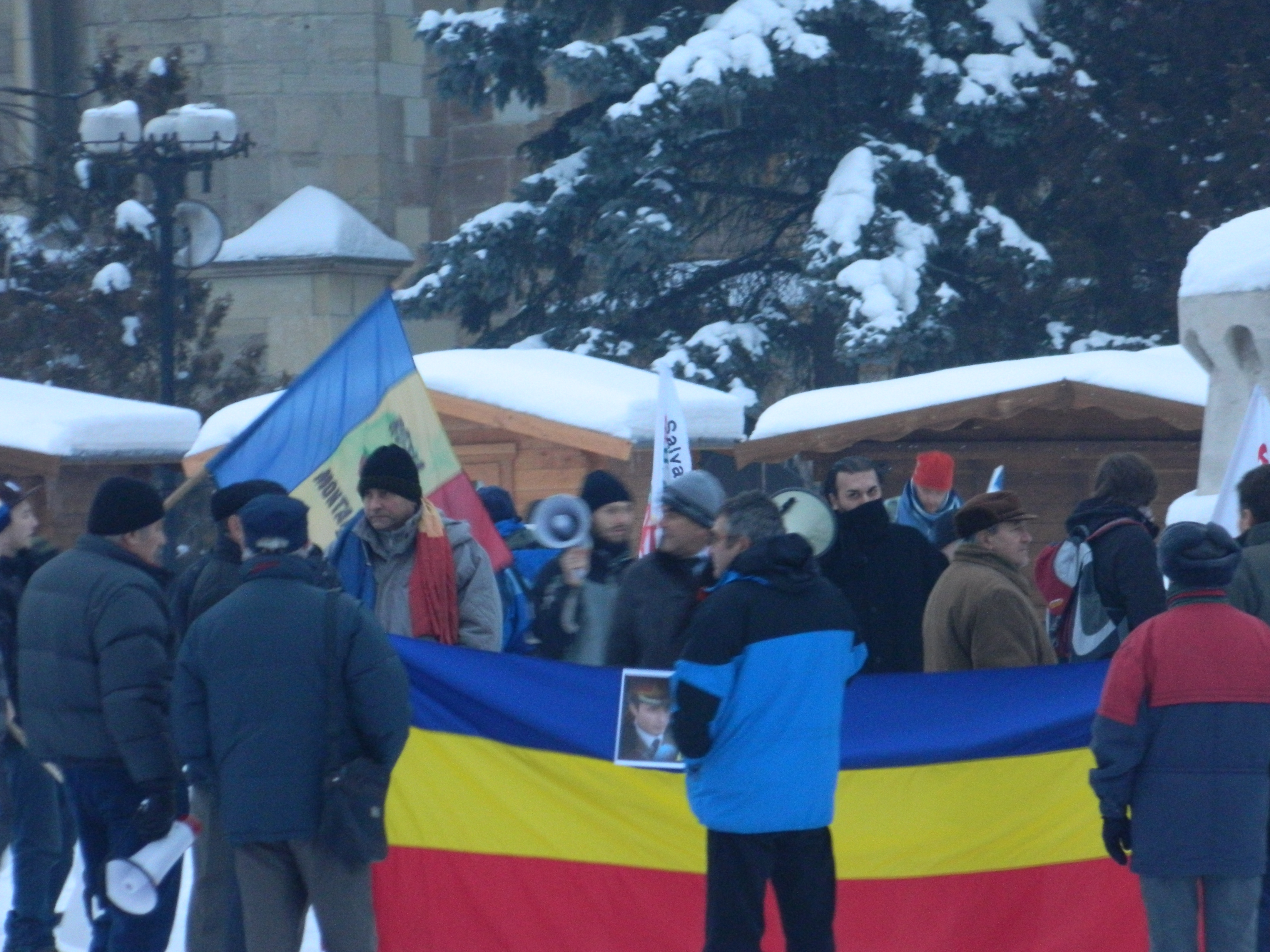 I can’t remember when I took this picture but it was last week sometime, when there was still snow on the ground (it’s all gone for now but I hear it’s coming back next week). This was a real combination, I saw anti-ACTA flags, lots of protesting about Rosia Montana and even something about military officers. Good stuff!