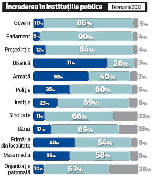 The Christian Ortodoxy religion is still powerful in the preferences of the romanians(71%),while The Army (53%) is the second…hmmm!, these institutions lead years and years in romanian visions and they don’t trust in the Parliament,in the Government and not in the Presidency institutions…(they had lied too much in over 20 years)…