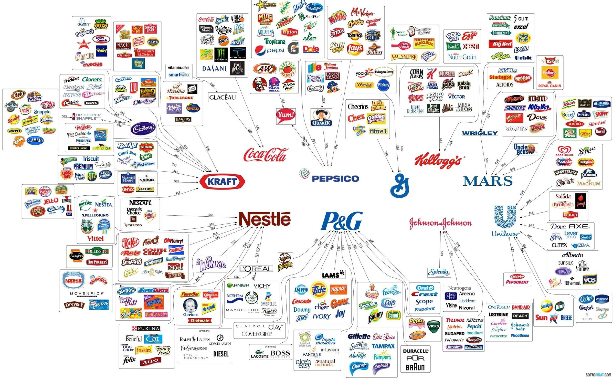 I could honestly write a university dissertation for a doctorate based solely on this graphic but right off the top what’s interesting is that the name of this graphic is “The Illusion of Choice” and the author’s original intent was to show Americans how little choice they actually have when it comes to food. See? You think you’re “choosing” between different brands but 90% of what you eat/drink and use for personal care are all owned by the same 10 companies.