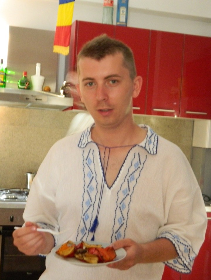Romanian guy wearing a Romanian shirt while standing underneath a Romanian flag and eating Romanian food. Do you love it?