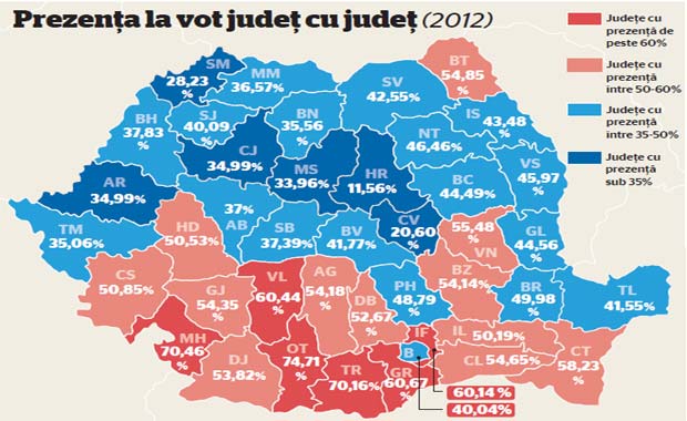 The above image is from Adevarul and struck me as incredibly significant. The blue counties are all those who had less than a 50% turn out and the orange/red ones are those with a higher than 50% turnout. Clearly the red ones seem to indicate a pro-USL (or anti-Basescu) stance while the blue ones are people who boycotted the elections for a variety of reasons.