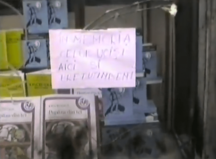 A few minutes later, Csilla is in front of the bookstore Universitatii (which still exists today) and films the candles left by people in memory of the people who were massacred by soldiers the day before. There is a handwritten sign in the window, which you can see below in my screencap: