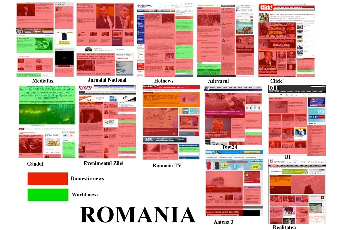 You can now easily see the preponderance of red. Four of these (Realitatea, B1, Jurnalul National, Antena 3) were red only, meaning every single article was about Romania.