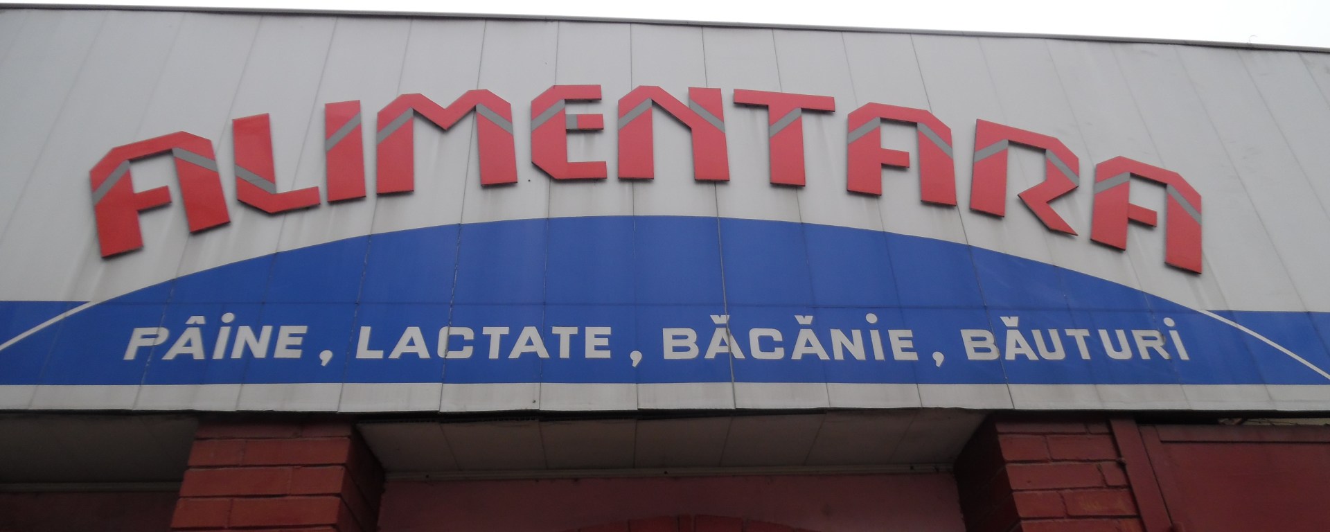 The word we were debating the meaning of is băcănie (buck-a-knee-uh). My wife was saying that a băcănie is a corner shop that sells food while I countered that the sign clearly indicated otherwise (the big red word says "Food store/shop" while underneath it says bread, dairy products, băcănie and drinks). DEX reveals that băcănie can also refer to spices or herbs that are added to foods.