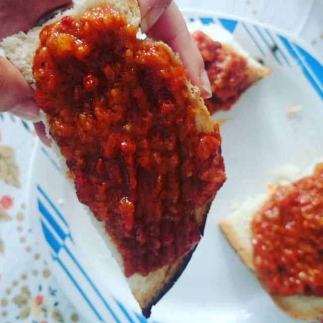 First, the eggplants and red peppers are charred. Then, in a pot, the onion is cooked until it becomes translucid. While that cools down, clean the eggplants and peppers. Then mince them through the machine, along with tomatoes and the cooled down onions. Toss everything together with oil and seasoning (bay leaves, black pepper, and salt), boiled for 2-3 hours and enjoy when it cools down. It is perfect when enjoyed during the winter season.