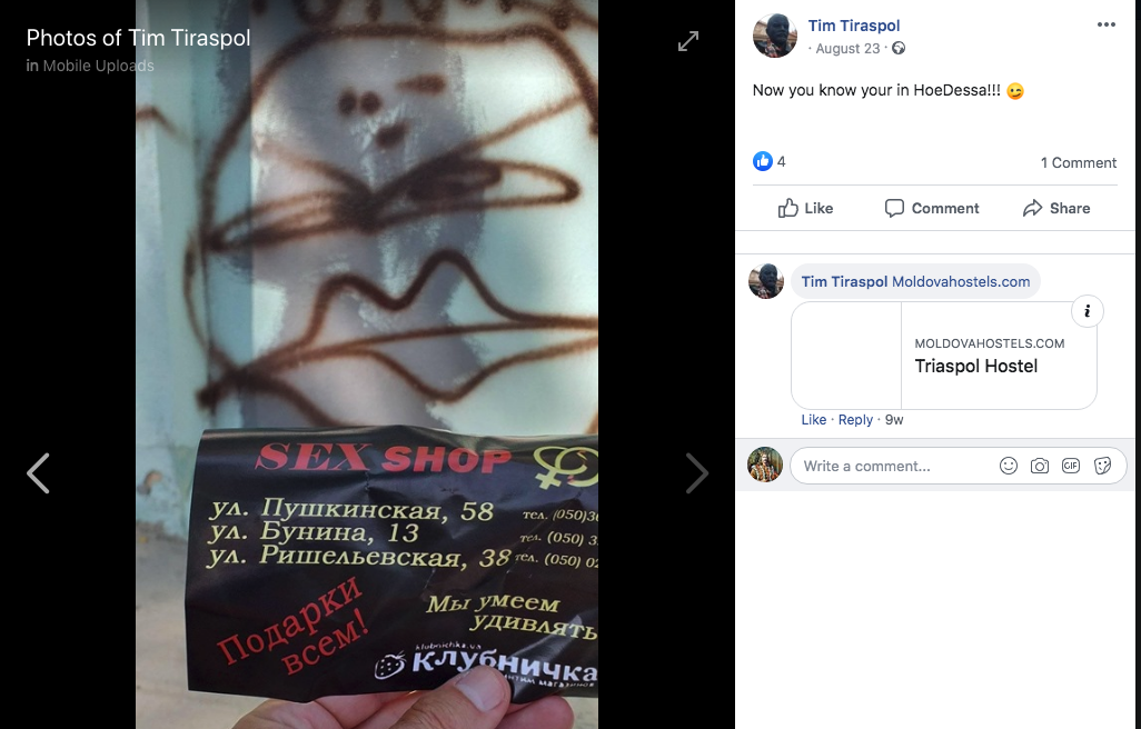 His shitty website, which hasn’t been updated since 2016, contains plenty of offers for “free vodka and parties with hot girls” in Tiraspol, and his Facebook feed is littered with godawful shit like this: