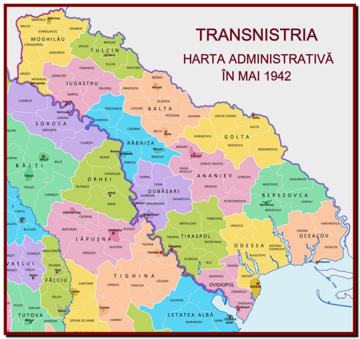 1942 administrative map of Bessarabia (Moldova) and Transnistria (separated by the thick purple line). Note that Transnistria is roughly the same size as Bessarabia.