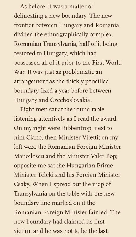 Secondly, the Hungarians saw this quiet acquiescence of their territory as a tacit admission that Romania did not give a shit about its borders, and so they convinced the Germans to “award” them Transylvania in a sham arbitration hearing.