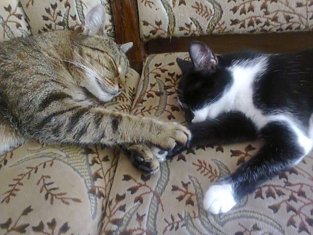 Taken on a warm summer day just a short time before Neva disappeared, it shows Mr. Zig and Neva stretched out on the balcony sofa, enjoying an afternoon snooze. Through happenstance, it looked as though Mr. Zig’s outstretched paw was grasping Neva’s, and the whole thing was so impossibly cute that I ran inside to get my camera.