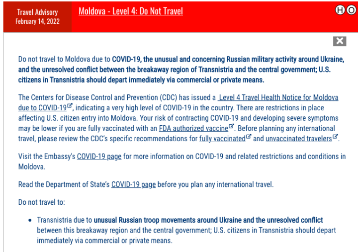 Officially, Moldova is now on the “DO NOT TRAVEL” list because of “unusual Russian troop movements around Ukraine.”