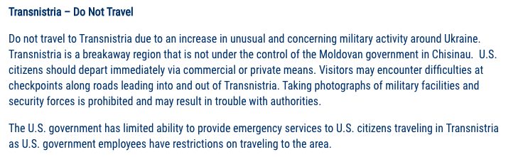 Secondly, I have no earthly idea why the US government is telling its citizens to depart “Transnistria” immediately because of what some soldiers are doing in Russia.